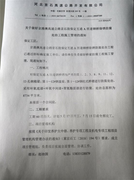 關于做好京港澳高速公路京石段保定互通A匝道鋼橋除銹防腐處治工程施工管理的通知