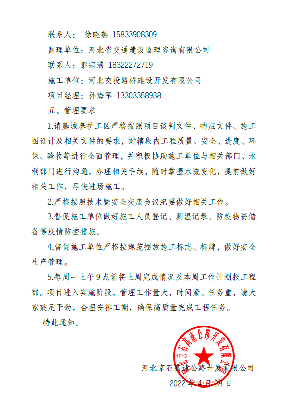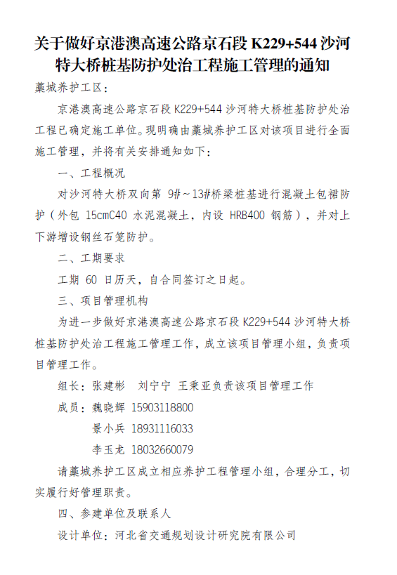 關(guān)于做好京港澳高速公路京石段K229+544沙河特大橋樁基防護(hù)處治工程施工管理的通知