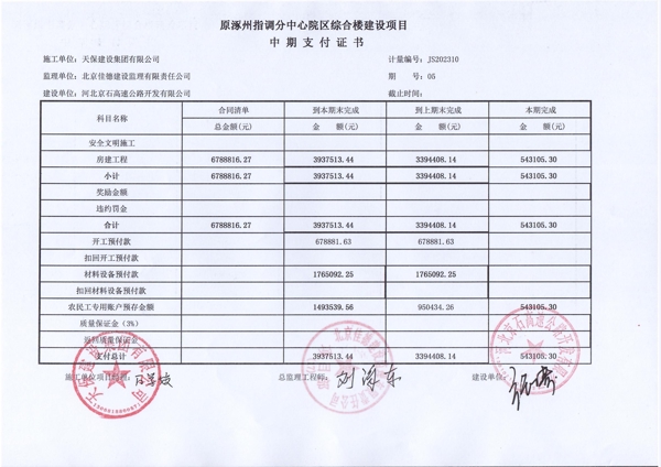 原涿州指調分中心院區(qū)綜合樓建設項目第五期中期支付證書