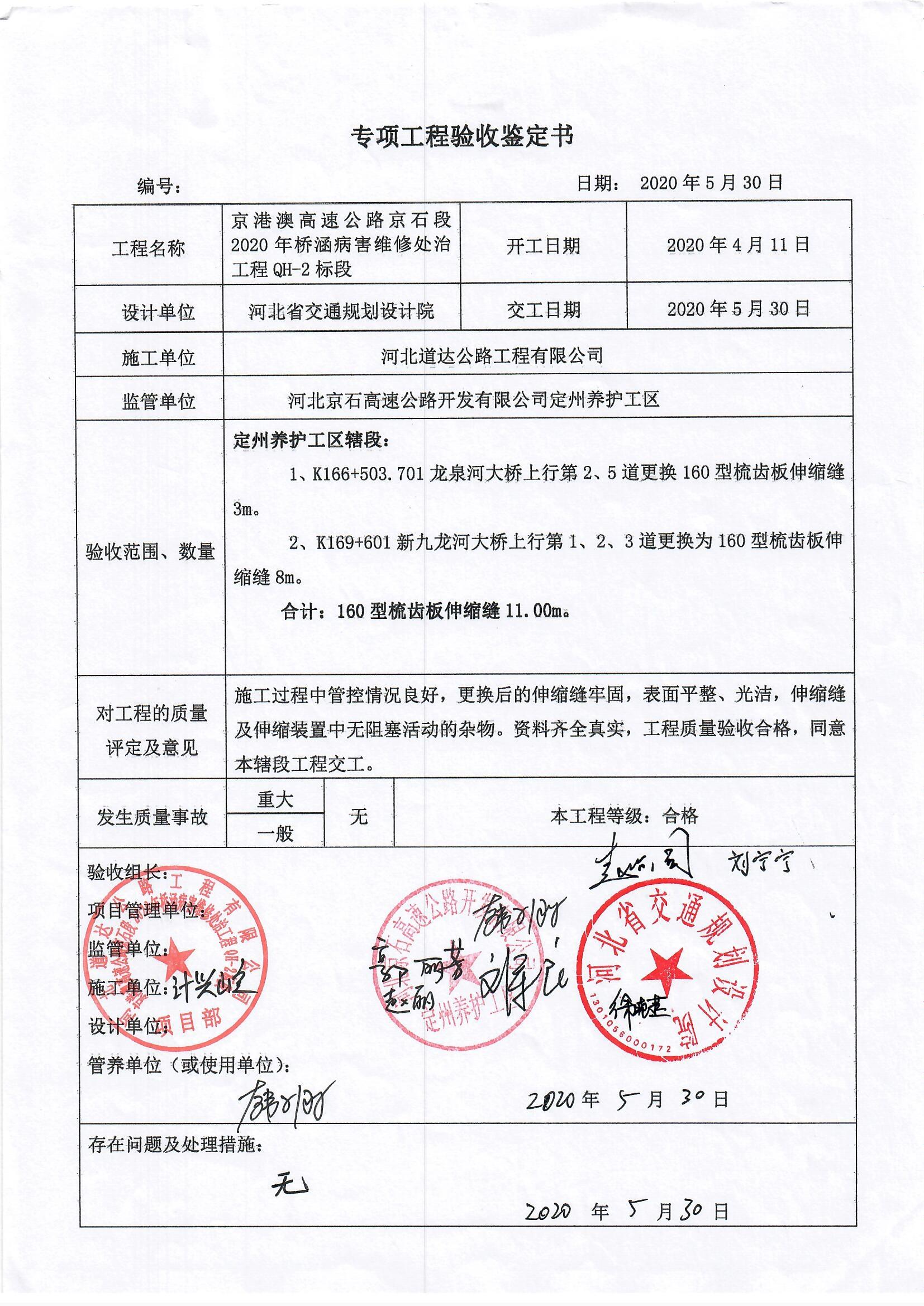 京港澳高速公路京石段2020年橋涵病害處治工程QH-2標(biāo)段驗(yàn)收證書(shū)
