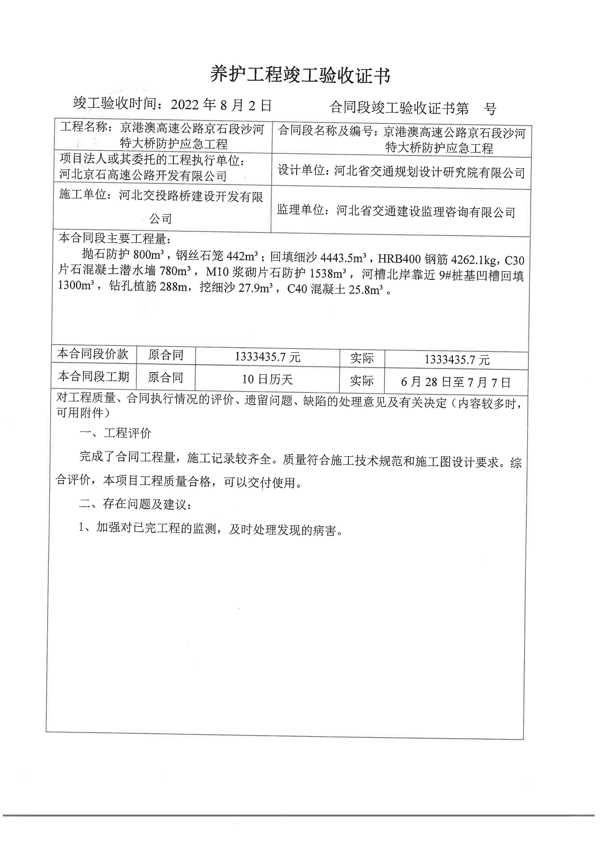 沙河特大橋樁基防護(hù)應(yīng)急工程驗收證書