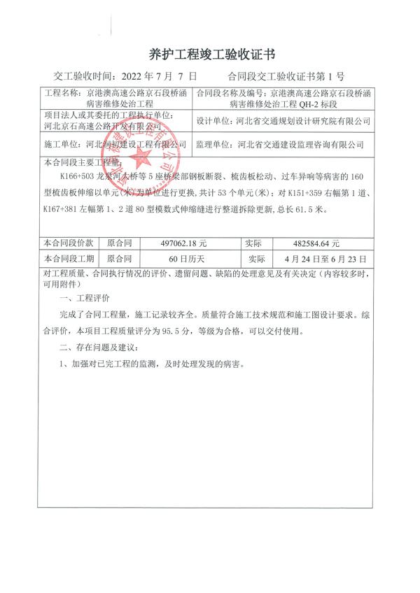 2022年橋涵病害維修處治工程QH-2標(biāo)驗(yàn)收證書(shū)
