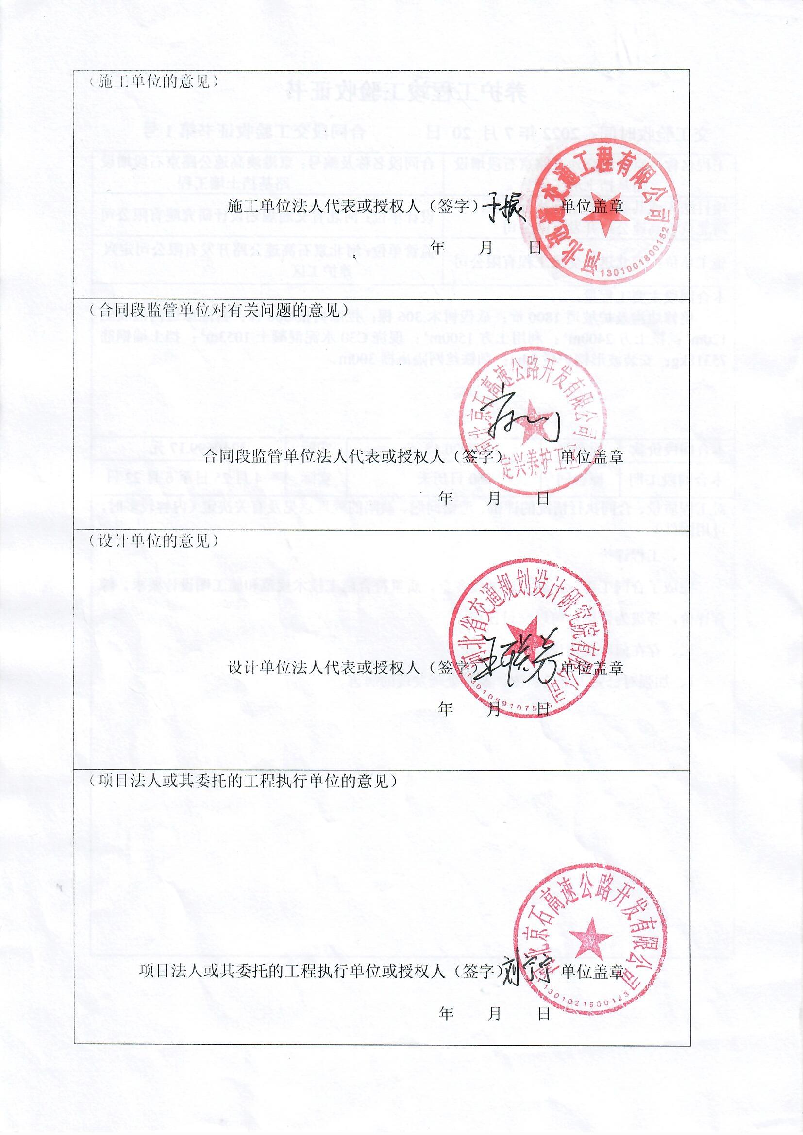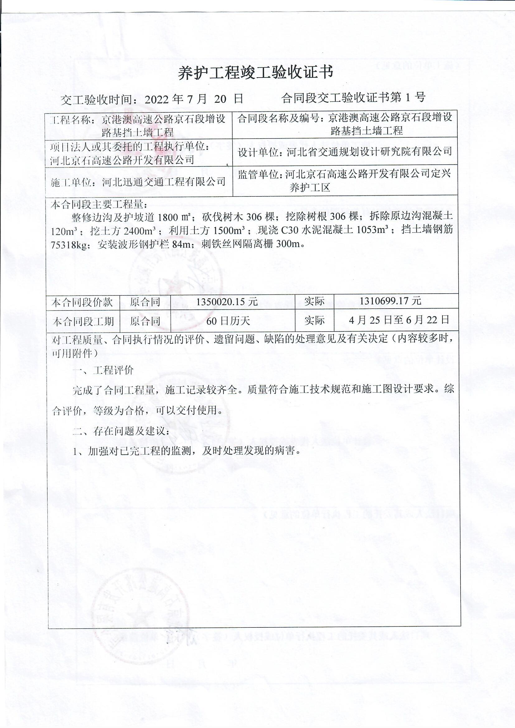 京港澳高速公路京石段增設(shè)路基擋土墻工程驗(yàn)收證書(shū)