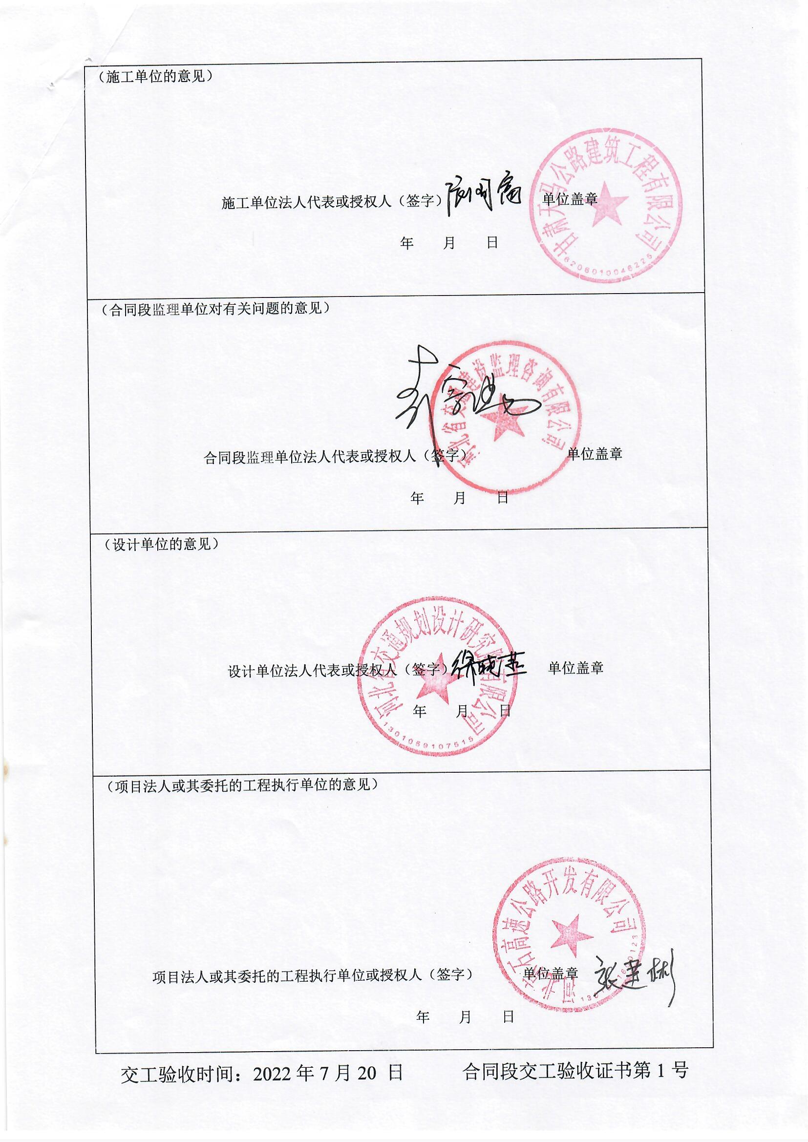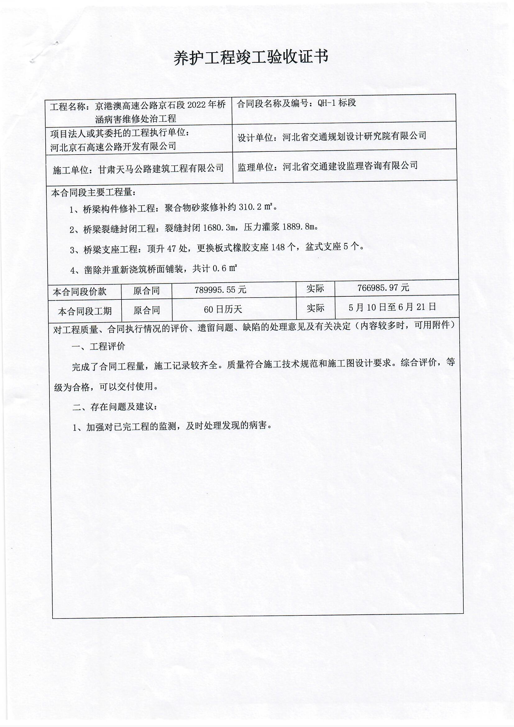 2022年橋涵病害維修處治工程QH-1標(biāo)段驗(yàn)收證書(shū)