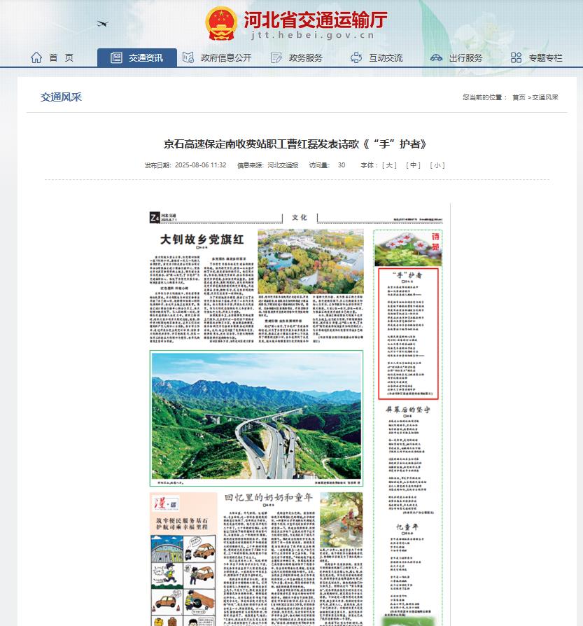 【河北省交通運輸廳】京石高速保定南收費站職工曹紅磊發(fā)表詩歌《“手”護者》