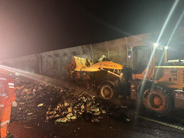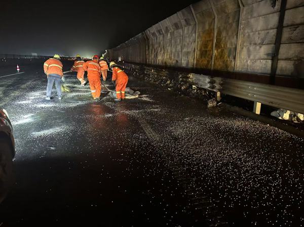 現(xiàn)場作業(yè)人員爭分奪秒地對事故現(xiàn)場進(jìn)行清理和救援。清障救援隊利用專業(yè)設(shè)備,將受損車輛快速拖離現(xiàn)場,工區(qū)作業(yè)人員利用大型機(jī)械清理路面上的散落物,同時為防止路面結(jié)冰,在清理后的事故路段撒布了融雪劑。經(jīng)過近三個小時緊張有序的奮戰(zhàn),事故現(xiàn)場的散落物終于被清理干凈,路面恢復(fù)了正常通行。