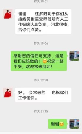 半小時(shí)后車主抵達(dá)三工區(qū),他激動地向巡查人員連聲致謝,并感慨道:“我本來沒報(bào)希望能找回來,你們的高速值班員和巡查員工作都很認(rèn)真負(fù)責(zé),讓我收到意外的驚喜,河北很棒,給你們點(diǎn)贊!”值班員則暖心回復(fù):“感謝您的信任與支持,這是我們應(yīng)該做的!祝您一路平安,歡迎常來河北!”