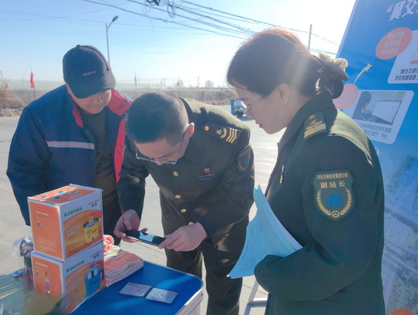 “師傅,歇腳時(shí)不妨看看這個(gè)!”工作人員手持宣傳頁(yè),向剛停穩(wěn)的貨車(chē)司機(jī)熱情介紹“冀交萬(wàn)里行”“京石易行”小程序,針對(duì)司機(jī)們關(guān)心的“操作復(fù)雜嗎?”“優(yōu)惠實(shí)在不?”等問(wèn)題,團(tuán)隊(duì)現(xiàn)場(chǎng)演示、耐心解答,把“年終沖刺”的干勁融入一句句貼心提醒里。