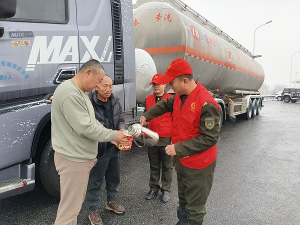 為打贏此次除雪保暢攻堅戰(zhàn),徐水站嚴(yán)格落實上級指示精神,制定了九條工作措施,全力保障道路安全通行。具體行動上,組織在站職工對收費(fèi)車道、廣場等關(guān)鍵區(qū)域撒融雪劑,從源頭上防范路面結(jié)冰及車輛追尾等安全事故,迅速組織人力投入收費(fèi)站口除雪作業(yè)。同時,徐水站在做好保暢通工作的同時做好延伸服務(wù)。將管控信息及時發(fā)布至貨車營銷群內(nèi),為過往司乘發(fā)放安全通行提示卡,安排專職人員協(xié)助300余名司乘注冊“限速通行”小程序順利通行;針對因封路滯留在收費(fèi)廣場的司乘,工作人員主動送上23桶泡面、10壺?zé)崴葢?yīng)急物資,緩解司乘的焦躁情緒。
