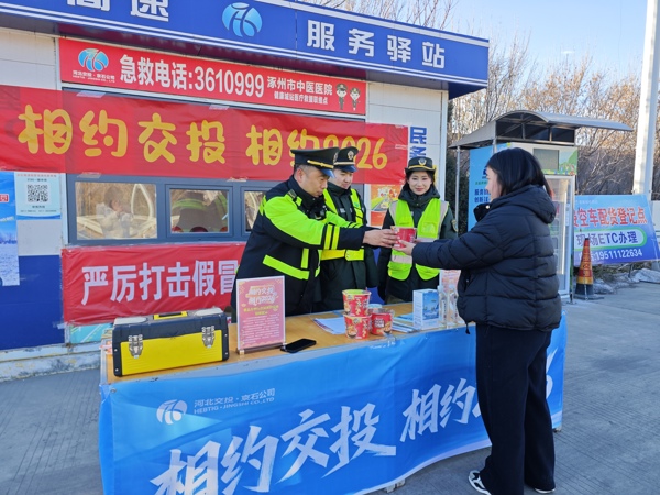 天氣雖然寒冷,站口卻暖意融融?!跋嗉s交投·相約2026”主題橫幅掛在顯眼處,洋溢著向新向上的新年氣象。工作人員身著整齊工裝,笑容親切,一邊耐心講解“冀交萬(wàn)里行”積分使用規(guī)則以及新年優(yōu)惠活動(dòng),邀請(qǐng)司乘加入會(huì)員暢享更多出行服務(wù);一邊將一杯暖姜茶、一次貼心指路、一件觸手可及的便民工具,化作實(shí)實(shí)在在的溫暖,連同真摯的新年祝福,親手遞送給過(guò)往司乘。